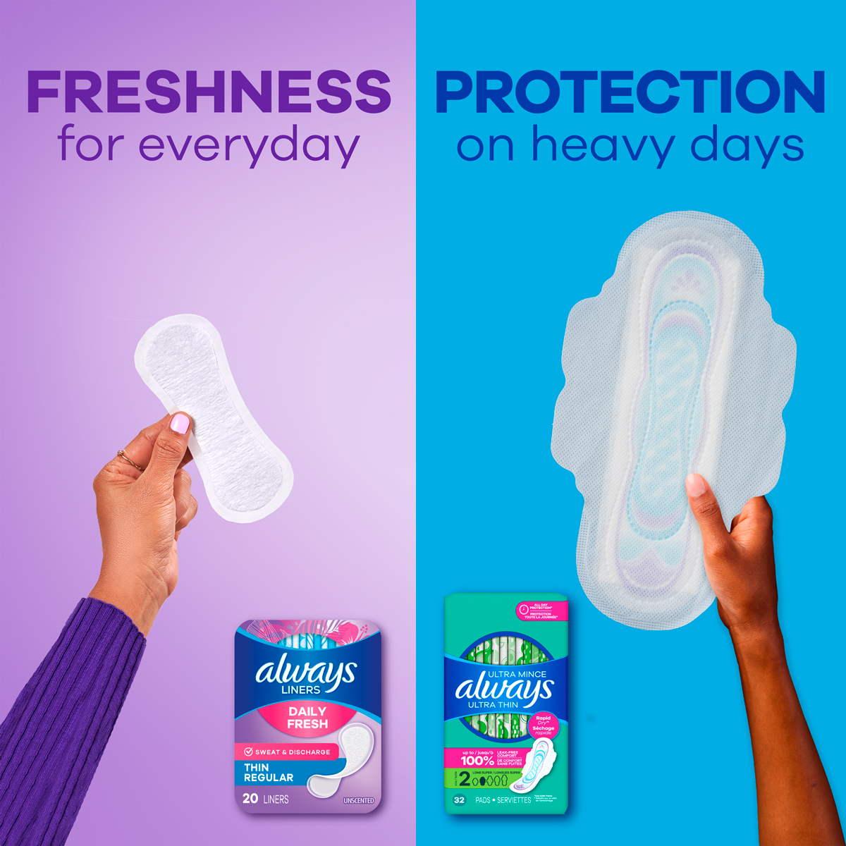 Want to feel clean and fresh? Discover Always Daily Fresh Thin Liners Regular for light protection against daily sweat and discharge. These pantiliners are designed to be thin, breathable, and absorbent for everyday freshness. Plus, Always Daily Fresh Thin panty liners feature a special Edge-2-Edge adhesive that holds better than traditional adhesives. That means once the panty liner goes on, you can trust that it will stay put no matter what activities you take part in. Errands, exercise, sports and other physical activities won't stand a chance against this liner that protects and stays put. For on-the-go freshness, these liners are individually wrapped, so you can take them anywhere. The "Find Your Best Always Liner" product chart shows a range of Always liners designed for different purposes, so you can find the best liner for your needs. Get daily protection against sweat and discharge that is so discrete, it's barely there. Created to be thin with light protection, Always Daily Fresh thin pantiliners can be worn every day. For a fresh feeling every day of the month, try Always Daily Fresh panty liners. These Always liners are designed to offer clean-feeling freshness no matter where your day takes you.