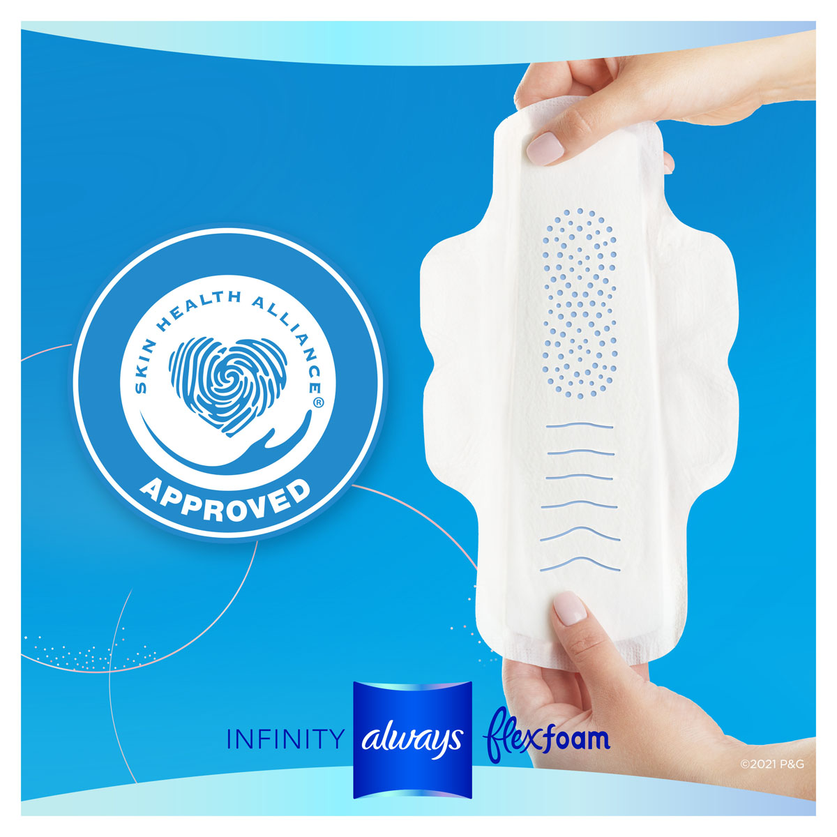 Always Infinity with Flexfoam menstrual pads have been dermatologically tested, and approved by the Skin Health Alliance, an independent organization led by dermatologists and scientists. The qualification process includes an assessment of the ingredients, and clinical trial data. Always FlexFoam products have been endorsed by the SHA for several years and we will continue working with professionals to ensure our products meet high external standards.