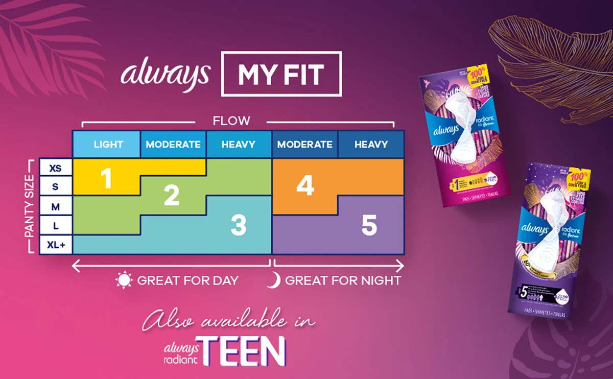 For day sizes, try Always Radiant FlexFoam Regular, Heavy Flow, or Extra Heavy Flow Absorbency period pads for up to zero leak, zero feel, and zero odor protection. And for those who are on-the-go, try Always Pocket Flexfoam, powerful protection made portable. Always Flexfoam menstrual pads are also FSA/HSA eligible.